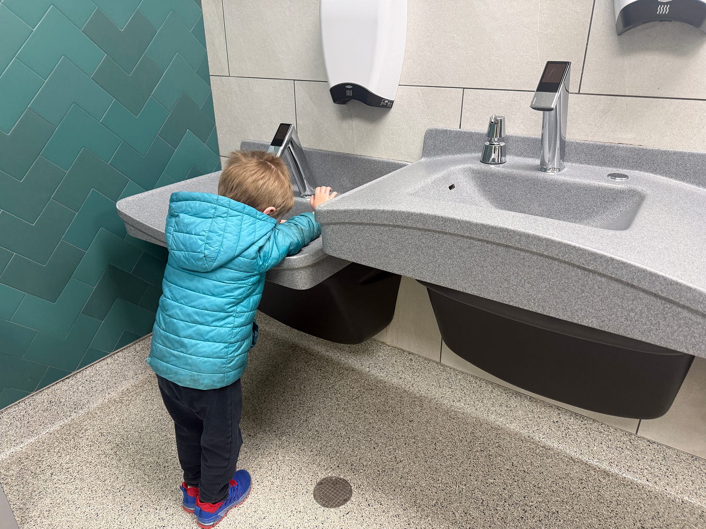 He gets frustrated. He thinks he’s doing something wrong. He can’t reach the sink. The water shuts off halfway through rinsing. The soap dispenser won’t trigger.